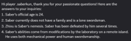 - ↑ According to a Dev-To-Players on the Official Discord Server regarding Saber's age and other details about his story